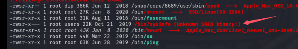 linpeas找到了一个未知的suid binary。运行后输出系统信息。使用strings /bin/sysinfo查看binary里的字符串